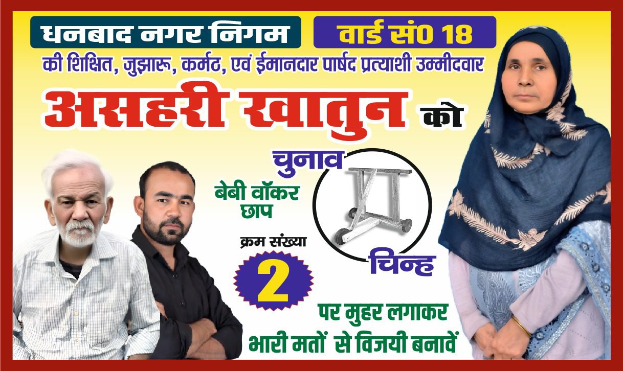 धनबाद। धनबाद नगर निगम चुनाव 2026 में वार्ड 18 की पार्षद प्रत्याशी असहरी खातून को चुनाव चिन्ह बेबी वॉकर आवंटित किया गया है। अपने चुनाव प्रचार में असहरी खातून ने कहा कि वार्ड 18 के विकास के लिए पूरा प्रयास किया गया। शिक्षा को बढ़ावा देने के लिए क्षेत्र में स्कूल का निर्माण, नागरिक सुविधा के लिए नाली, सड़क, स्ट्रीट लाइट का निर्माण, वृद्धा विधवा व विकलांग लोगों को पेंशन योजना का लाभ दिलाने में सहयोग किया।