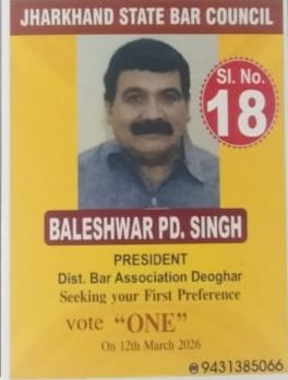 धनबाद/देवघर। झारखंड स्टेट बार काउंसिल 2026 के चुनाव में सदस्य के लिए देवघर बार एसोसिएशन के अध्यक्ष बालेश्वर प्रसाद सिंह ने झारखंड स्टेट बार काउंसिल के चुनाव में सदस्य पद के लिए सीरियल नंबर 18 पर वोट देने की अपील की।