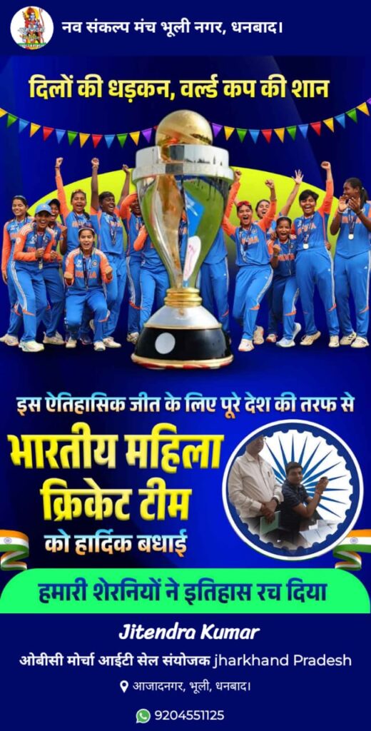 भूली। जितेंद्र कुमार समाज सेवक भूली नगर ने भारतीय महिला क्रिकेट टीम की ऐतिहासिक जीत पर बधाई दी है। विश्व कप चैंपियन बनने का भारत का सपना पूरा हुआ। पहली बार भारतीय महिला टीम ने विश्व कप चैंपियन बनी है। भारत की तमाम बेटियों की संदेश है कि मेहनत से लक्ष्य प्राप्त की जा सकती है। इस बार चौथे पायदान पर भारतीय टीम थी परंतु जो कर दिखाया यकीन नहीं हो रहा है बस सिर्फ जज्बा और मेहनत का नतीजा है।