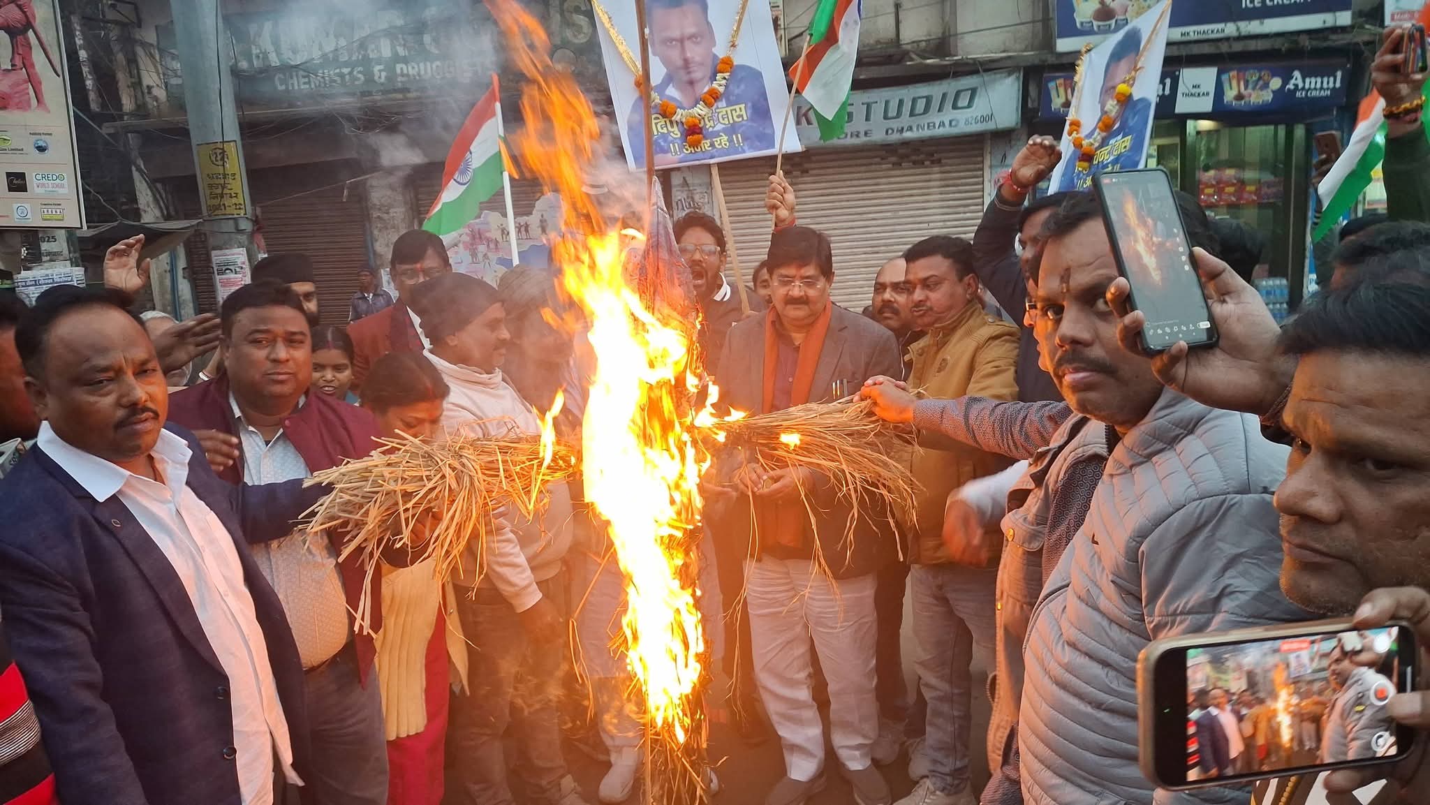 धनबाद। बांग्लादेश में हिंदू समाज पर निरंतर हो रहे अत्याचार, हिंसा एवं अमानवीय कृत्यों के विरोध में मंगलवार को भाजपा मनईटांड़ मंडल द्वारा मनईटांड़ गोल बिडिंग से बिरसा चौक बैंकमोड़ तक एक सशक्त आक्रोश प्रदर्शन निकाला गया । इस अवसर पर बांग्लादेश के प्रधानमंत्री का पुतला दहन कर विरोध प्रकट किया गया तथा कैंडल प्रज्वलित कर दिवंगत दीपू चंद्र दास को श्रद्धांजलि अर्पित की गई।
