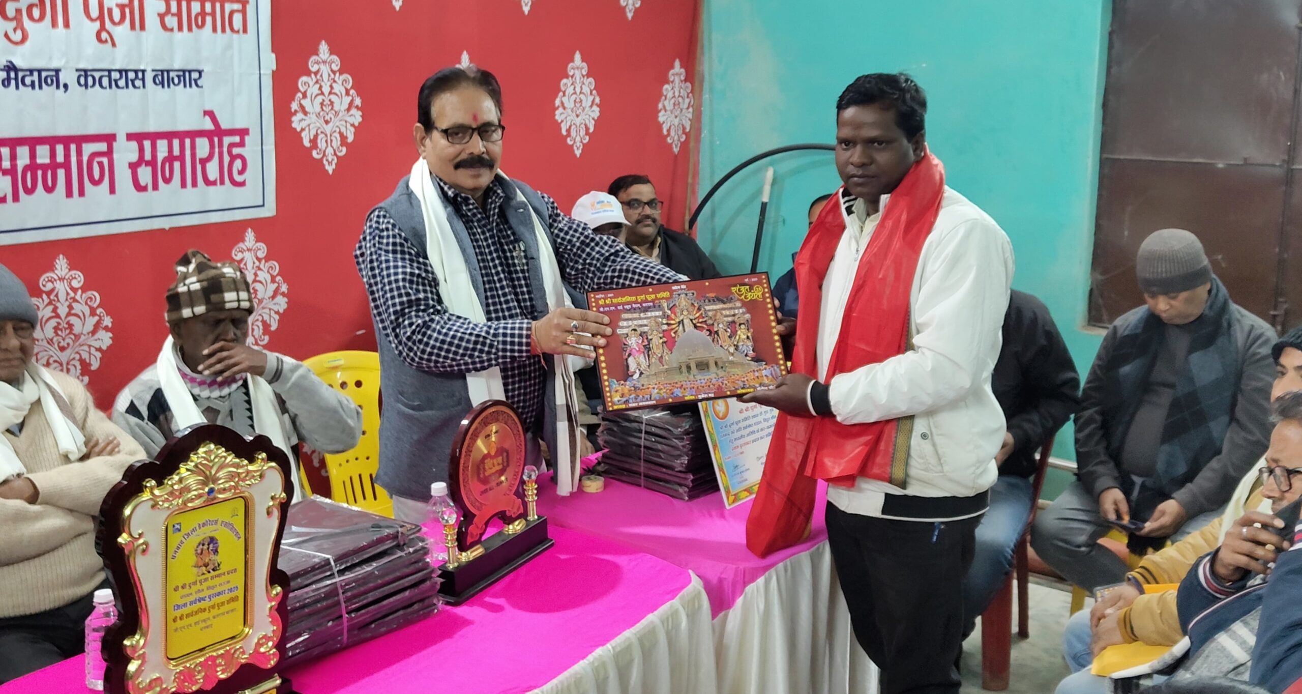 कतरास। कतरास में श्री श्री सार्वजनिक दुर्गा पूजा समिति जी एन एम हाई स्कूल मैदान में भव्य दुर्गा पूजा का आयोजन किया गया था। सफल आयोजन को लेकर दुर्गा पूजा समिति ने योगदान देने वाले समिति सदस्यों के साथ प्रशासनिक सहयोग के लिए कतरास थाना प्रभारी असित कुमार सिंह को सम्मानित किया गया। वहीं दुर्गा पूजा के भव्य आयोजन का खबरों के रूप में संकलन और प्रकाशन सहयोग के लिए स्थानीय पत्रकार को सम्मानित किया गया।