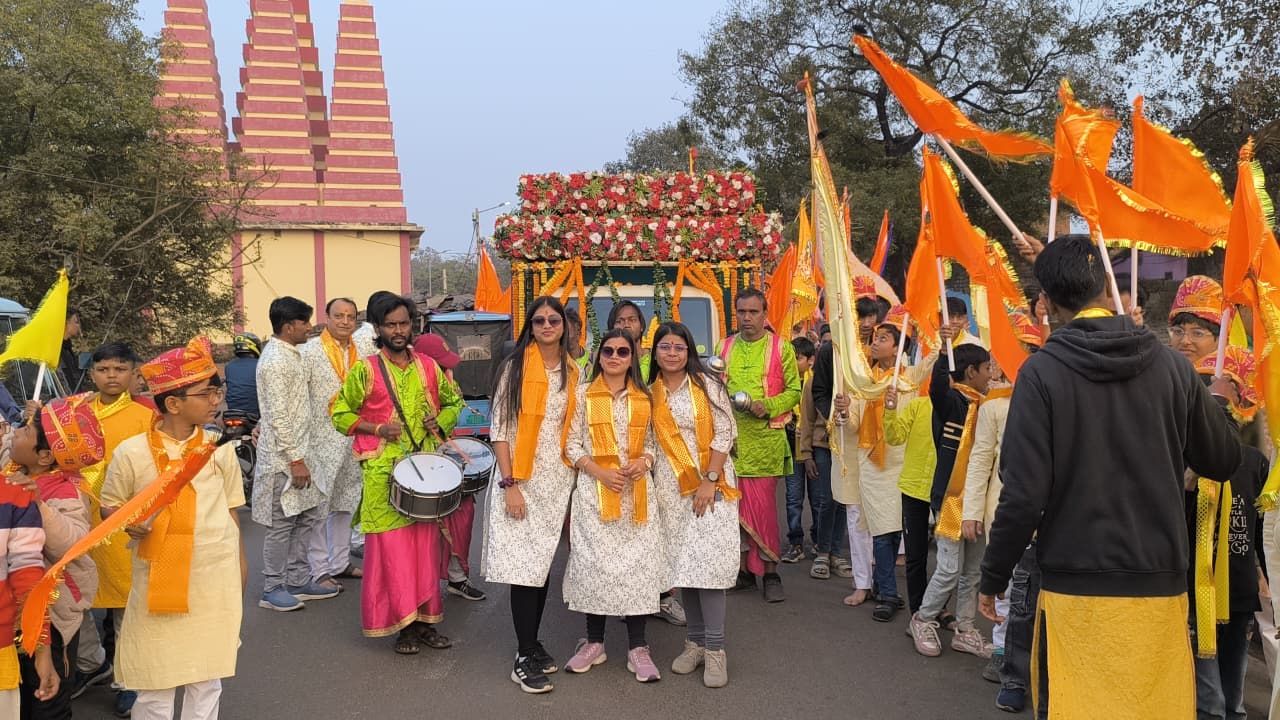 बच्चों के हाथों में धर्म ध्वजा निशान