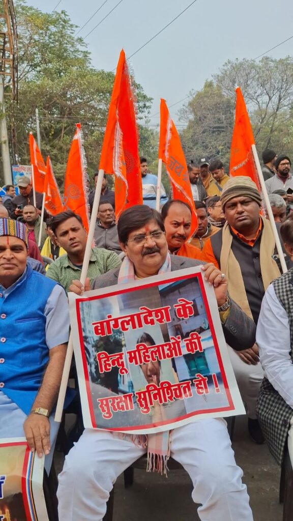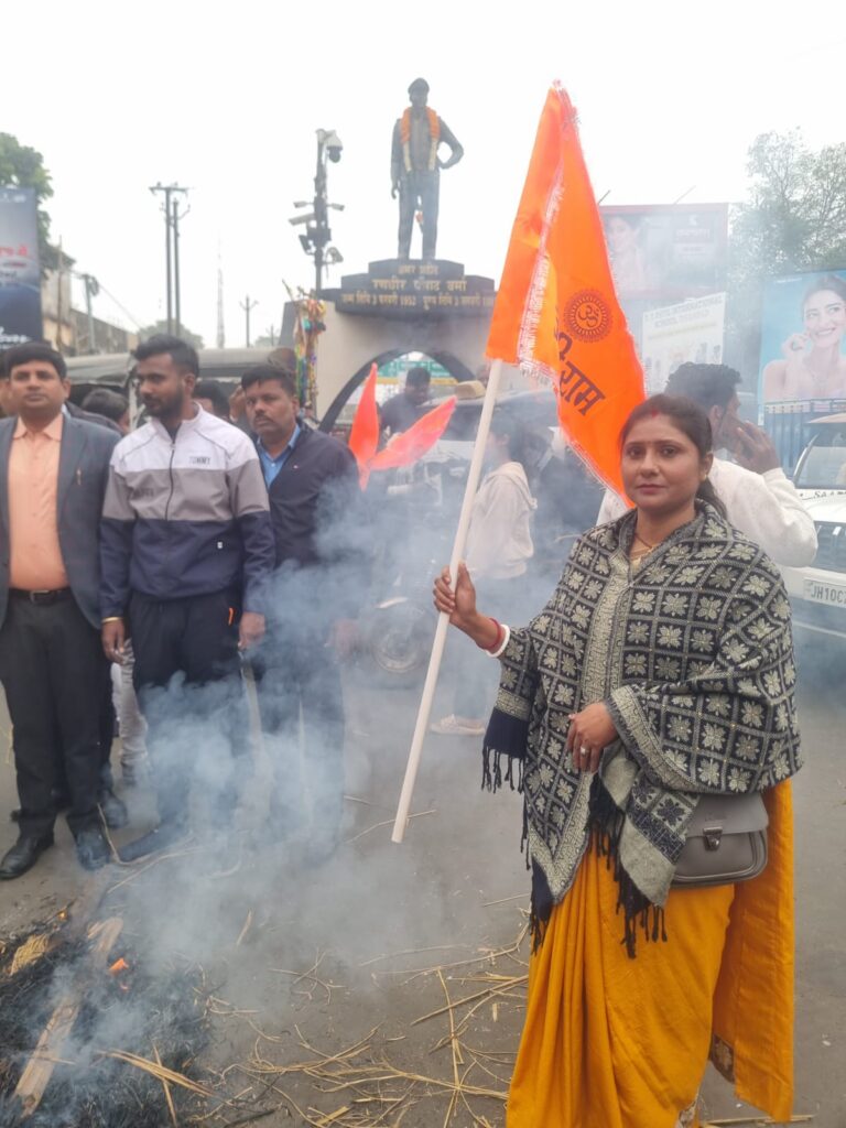 धनबाद। बांग्लादेश में निरंतर हिंदू समाज एवं पवित्र मंदिरों पर हो रहे कायरतापूर्ण हमलों के विरोध में रविवार को सनातन धर्म जागरण समिति, धनबाद द्वारा रणधीर वर्मा चौक पर आयोजित आक्रोश सभा में एकदिवसीय धरना एवं पुतला दहन कार्यक्रम का आयोजन किया गया। कार्यक्रम में धनबाद के पूर्व सांसद पशुपति नाथ सिंह, धनबाद सांसद ढुल्लू महतो, धनबाद विधायक राज सिंहा, निवर्तमान महापौर चंद्रशेखर अग्रवाल , निरसा की पूर्व विधायक अपर्णा सेन , सिंदरी की पूर्व विधायक तारा देवी सहित दर्जनों राजनेताओं ने हिस्सा लिया और संबोधन किया।