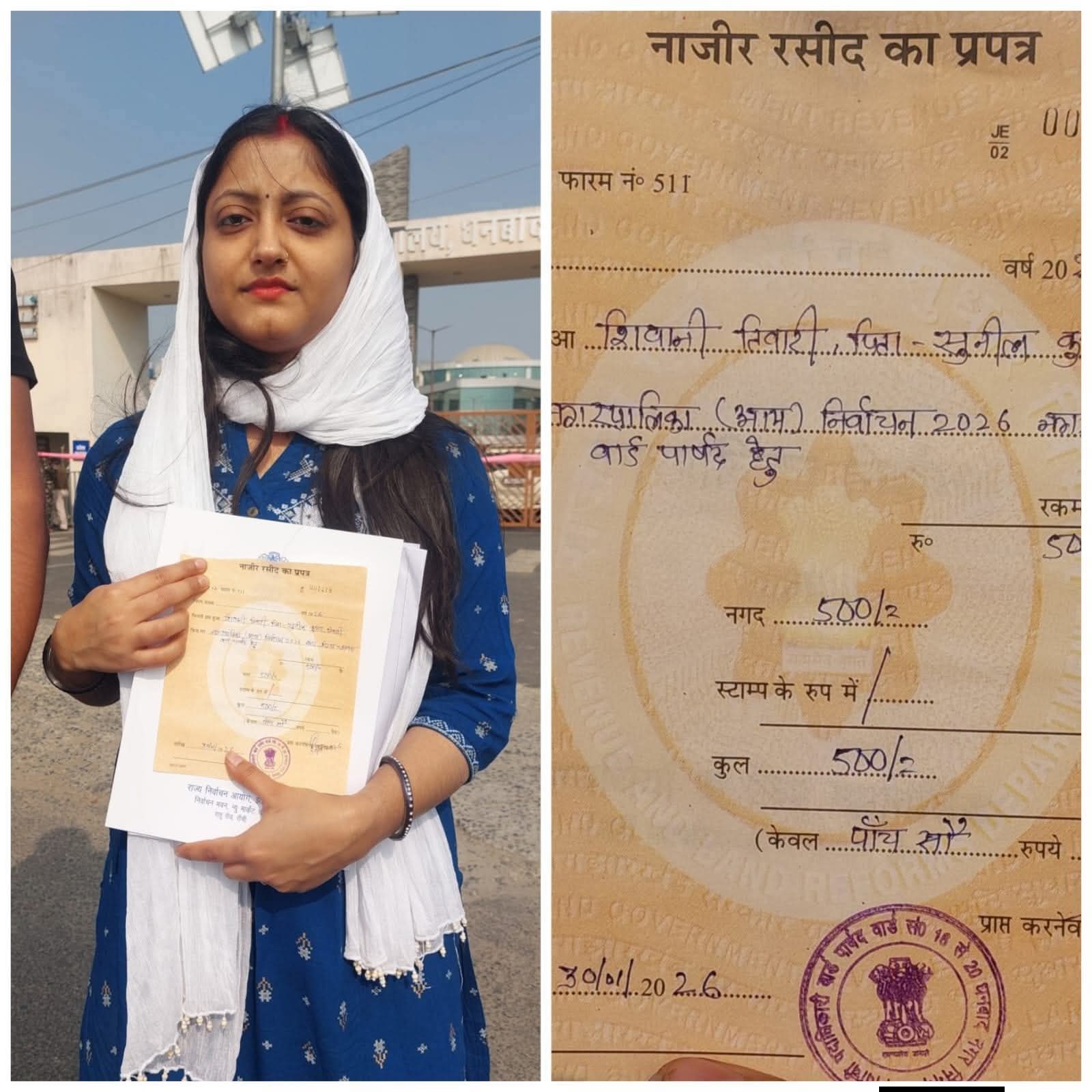 भूली। भूली के वार्ड 16 से बतौर पार्षद प्रत्याशी शिवानी तिवारी ने नामांकन पत्र लेते हुए अपना दावा पार्षद प्रत्याशी के रूप में किया। शिवानी तिवारी ने कहा कि धनानंद नगर निगम चुनाव 2026 में वार्ड 16 में विकास की लंबी लकीर खींचूंगी। मेरे पास वार्ड 16 में विकास के लिए पूरी योजना है जिसमें बच्चों के प्राथमिक शिक्षा के विकास और उच्च शिक्षा तक गुणवत्तापूर्ण शिक्षा की व्यवस्था, पानी सड़क सफाई की योजना के साथ वार्ड 16 की युवतियों और महिलाओं के आर्थिक विकास को लेकर योजना है। वार्ड 16 को सांस्कृतिक और साहित्यक वातावरण के रूप में तैयार करने के साथ वार्ड 16 के सौंदर्यीकरण का कार्य के रूप में बेहतर योजना के साथ काम करूंगी।